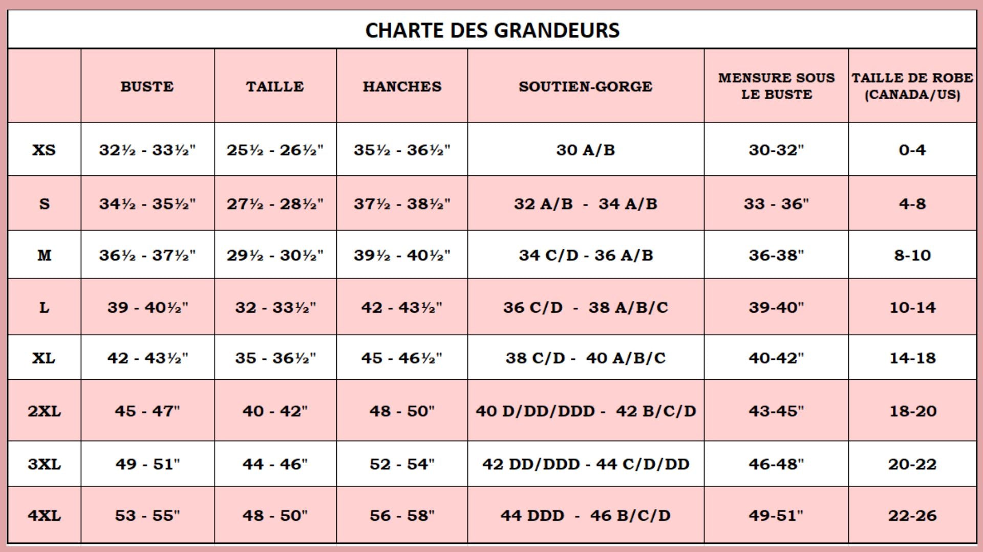 TAILLES INCLUSIVES XS-4XL